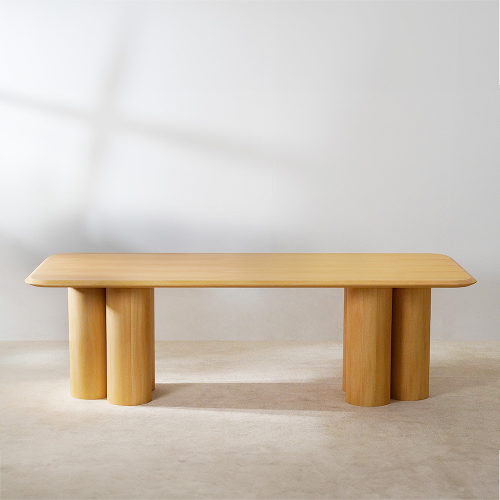 Cette grande table à manger moderne est soutenue par trois colonnes en bois massif épaissi des deux côtés, intégrant la trigonométrie et le minimalisme italien.La surface de la table à manger en bois massif est lisse et sans bavures.Des coins de sécurité bien conçus protègent votre santé et celle de votre famille.Disponible dans les options de matériaux en bois de frêne et de noyer.